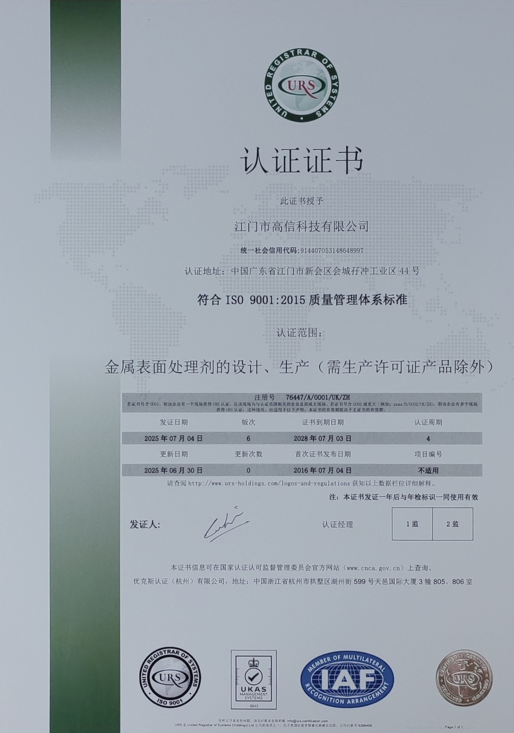 江門市高信科技有限公司是一家集研發(fā)、生產(chǎn)、銷售、服務(wù)于一體的國家級高新技術(shù)企業(yè)。公司于2001年開始研發(fā)、生產(chǎn)、銷售金屬表面處理劑、自動化控制設(shè)備、電鍍設(shè)備,產(chǎn)品主要應(yīng)用在本田、豐田、日產(chǎn)、格力、美的、戴爾、宜家等公司產(chǎn)品上。公司始終以市場需求為己任,秉持“誠信、品質(zhì)、專業(yè)、追求卓越、自強不息”的企業(yè)精神,以對社會與環(huán)境、對客戶與協(xié)作商、對員工和股東負責(zé)為經(jīng)營理念,致力研發(fā)尖端技術(shù)、施行卓越管理、......